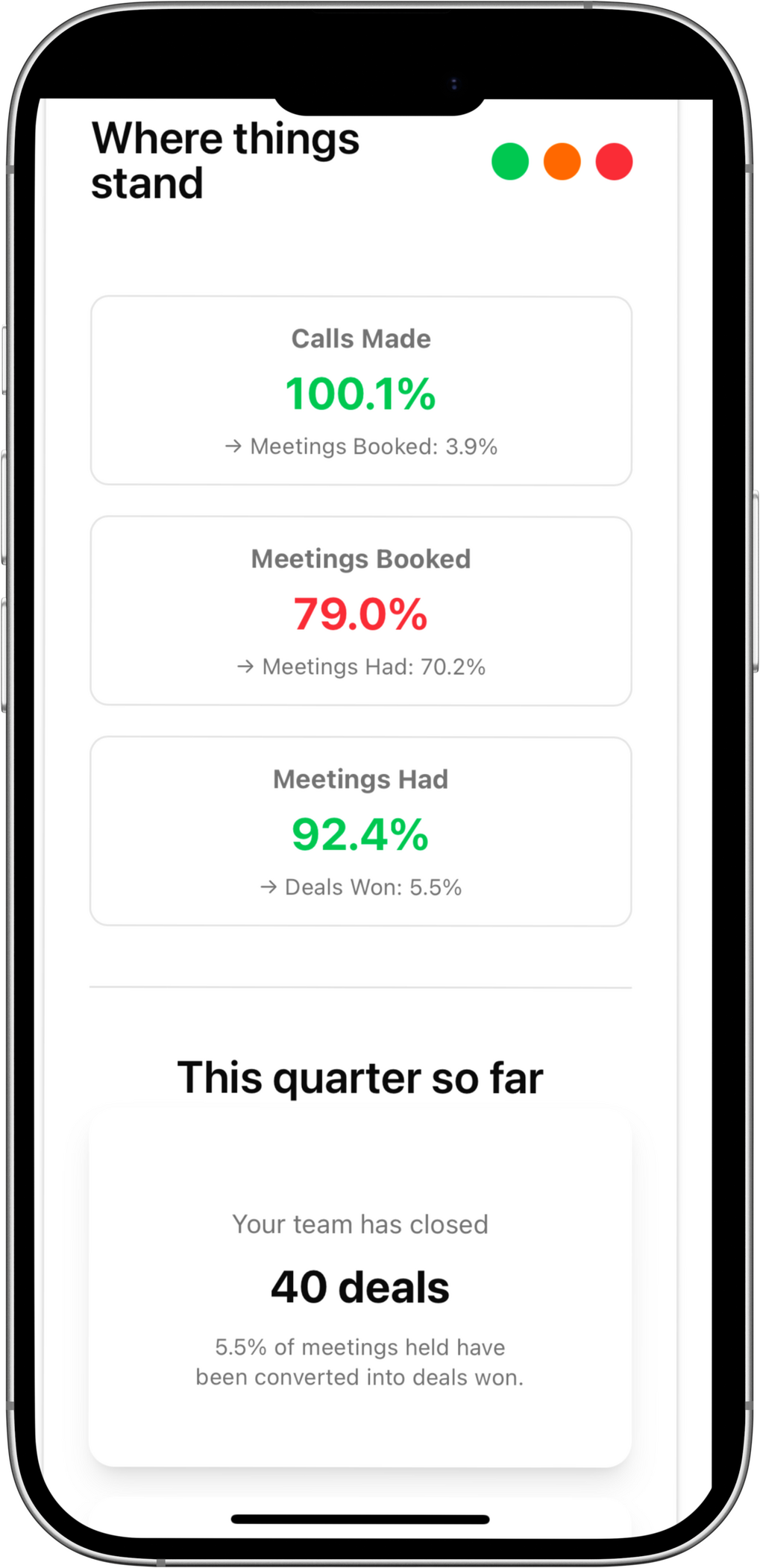 A lightweight app that shows you where things stand—every day. It sets daily expectations, keeps the team on pace, sends reminders, and catches problems before revenue slips.Set up in minutes. No integrations.